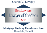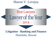 Sharon V. Lovejoy represents clients in a wide variety of litigation matters with primary focus in commercial, real estate and business litigation. Ms. Lovejoy has been named to The Best Lawyers in America®, "Lawyer of the Year" in Honolulu list, Appellate Practice (2020), Mortgage Banking Foreclosure Law (2015, 2019, 2024, 2026) and Litigation-Banking & Finance (2014, 2022, 2025). Lovejoy is also recognized by The Best Lawyers in America® (in “Appellate Law”, "Arbitration", "Banking & Finance Litigation", "Bet-The-Company" "Commercial Litigation", "Construction Litigation", "Eminent Domain and Condemnation Law", "Environmental Litigation","Real Estate Litigation", “Mortgage Banking Foreclosure Law”, "Qui Tam Law", "Land Use & Zoning Litigation" and "Mass Tort Litigation/Class Action-Defendants", "Mass Tort Litigation/Class Action-Plaintiffs"), selected for inclusion to the "Top 25", Hawaii Super Lawyers® list in 2023-2025, selected to the Hawaii Super Lawyers® list (in “Business Litigation”) since 2010, and recognized by Chambers and Partners Leading Lawyers for Business (in "Commercial Litigation").